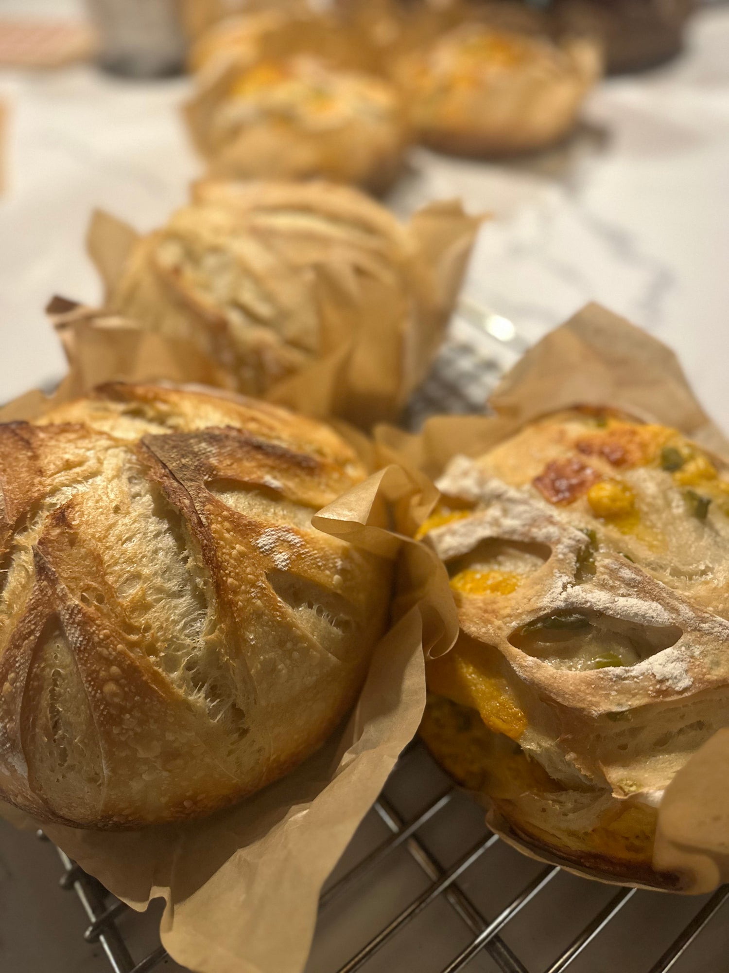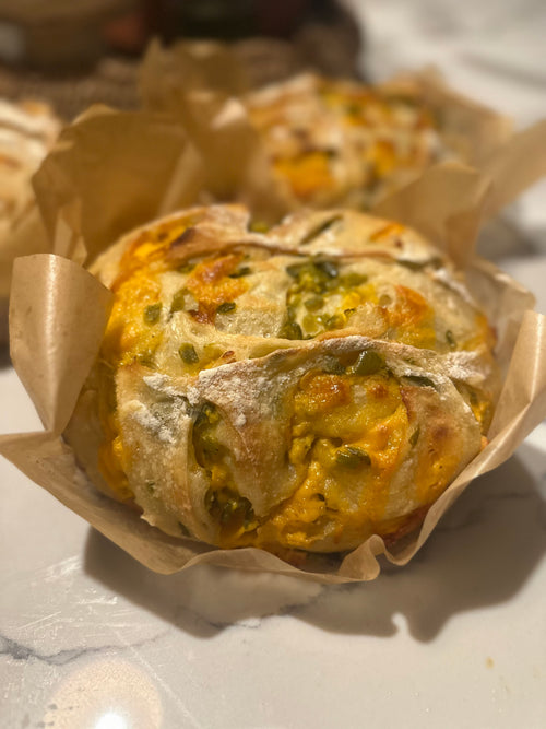 Baked until rich golden brown with a crackling crust, each loaf opens along its hand-scored pattern, creating the signature ear and texture that sourdough lovers crave.